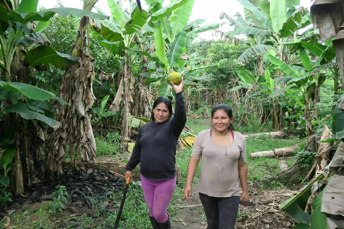 Heute ist Alexandra Avilés mit Úrsula Pizango unterwegs, der Frau von Holmer Machao. Sie ernten Kakaoschoten und ziehen später Maniokknollen aus der Erde. „Daraus setzen wir Chicha an“, erklärt Avilés. „Wir haben von Reis über Papaya bis zu Kochbananen vieles angepflanzt und bedienen uns ansonsten im Regenwald oder im Fluss.“