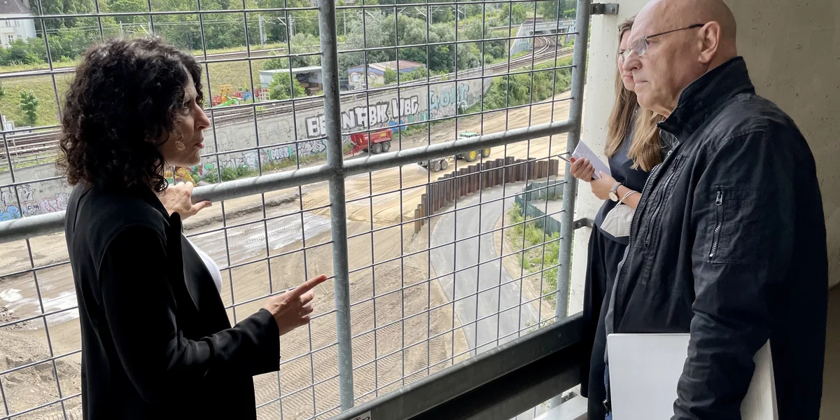 „Vom obersten öffentlichen Parkdeck aus kann man sehr gut erkennen, was unser Problem ist“, erklärt Bernd Kalweit von der Anwohner*innen-Initiative A100 Treptow. Er und seine beiden Mitstreiter führen Jarasch zur südöstlichen Ecke, durch ein Gitter fällt der Blick auf die Gleise der Ringbahn und der Görlitzer Bahn, dahinter Wohngebäude und viel Grün. Nach rechts zieht sich vor dem Ring-Bahndamm eine planierte Fläche, ganz hinten sind Spundwände erkennbar: Dort wird die A100 in ein paar Jahren aus dem tieferliegenden Trog an die Oberfläche kommen.