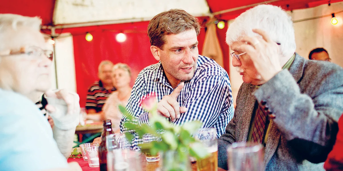 Hier draußen, ganz am Rande der Großstadt, stehen 20 Männer in Holzfällerhemden im Kreis – und Metin Hakverdi. Er hat sich für diesen Abend einen Schlips umgebunden, in Sozialdemokratie-Rot. Im Grunde ist es bei den Bauern doch auch nicht anders als bei den alten Leuten, mit denen Hakverdi im Heim ein Stück Kuchen isst: Sie mögen es, wenn ihnen der Bundestagskandidat zuhört.