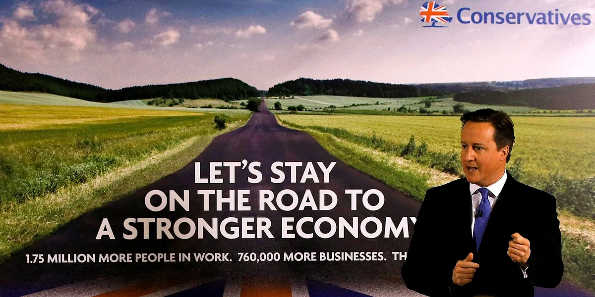 Mit diesem Slogan wirbt der britische Premier David Cameron für die Wiederwahl seiner konservativen Tories bei der Unterhauswahl im Mai 2015. Darunter stehen die erreichten politischen Ziele seiner Partei wie die Halbierung des Haushaltsdefizits. Laut der Zeitung Daily Mail haben sie aber das Defizit lediglich um 40 Prozent gesenkt.