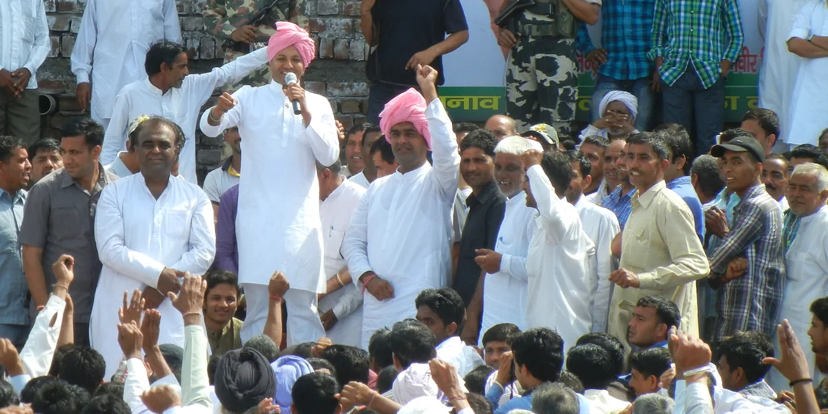 Yadavs Jeep mit wehenden Fahnen ist pünktlich da. Er ist hier offensichtlich unter seinesgleichen: Auch er hat einen akkuraten, leicht ergrauten Vollbart – doch er trägt eine traditionelle Kurta, ein Gewand, das bis zu seinen Knien reicht. Eine weiße Bauernkappe schmückt den Kopf. Bevor er sich auf seinen Sitz im Podium begibt, macht er die Runde und gibt allen Anwesenden die Hand. „Ich wollte dir nur sagen: ich bin voll hinter euch!“ sagt ein Mann und schüttelt Yadav energisch die Hand. Der lacht charmant und bedankt sich.