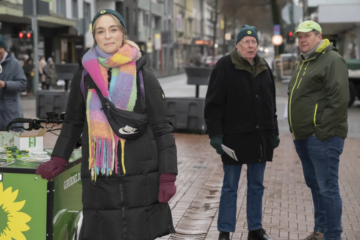Grünen-Kandidatin Nyke Slawik steht bereits seit 9 Uhr morgens am Wahlstand, einem umfunktionierten Lastenrad. Buntstifte und zwei verschiedene Flyer liegen aus. Slawik bietet einer Passantin einen mit Noch-Vizekanzler Robert Habeck zum Mitnehmen an, „da steht auch was Inhaltliches drin“. Ein Wahlhelfer scherzt: „Du gehst aber besser.“ Slawik, 31, ist Opladenerin und 2021 über einen Listenplatz in den Bundestag eingezogen. Eben hat sie mit einem Cannabispatienten über seine Befürchtung gesprochen, die Regelung könne rückgängig gemacht werden. Wohnungsmarkt, Verkehrsplanung sind die lokalen Themen. Mit Karl Lauterbach hat sie gemeinsam einen Brief an Noch-Verkehrsminister Volker Wissing geschrieben, es geht um „Tunnel statt Stelze“. Kein überirdischer Autobahnbau ist ein Thema, das die Leverkusener Stadtgesellschaft eint.