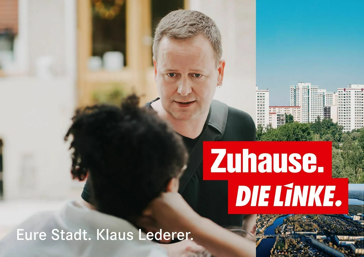 Man achte auf den Riemen der Umhängetasche über Klaus Lederers Schulter. Der Spitzenkandidat ist auf dem Sprung, klar, hat viel zu tun, aber er kümmert sich auch, nimmt sich Zeit. Im Vordergrund sein Gegenüber, dem er sich zuwendet, im Hintergrund ein Stück Stadt. „Eure Stadt. Klaus Lederer“, steht darunter, und das kumpelige Du geht wegen der Schultertasche knapp in Ordnung.