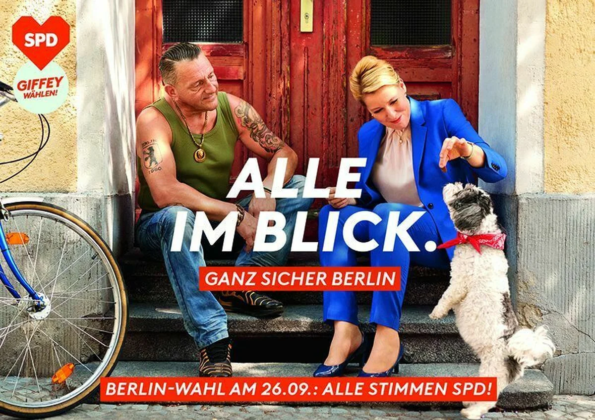 Die Kandidatin selbst setzt auf knalliges AfD-Blau, akkuraten Scheitel und das Thema Sicherheit. Ob sie vor Kampfkötern und Tätowierten schützen oder die Wurstversorgung garantieren will, bleibt ungewiss. Immerhin der Ausdruck ist sympathisch. Doch statt „Alle im Blick“ hat Giffey nur Augen für den Hund. Womöglich mag sie Tiere einfach lieber als Mieter*innen. Erik Peter