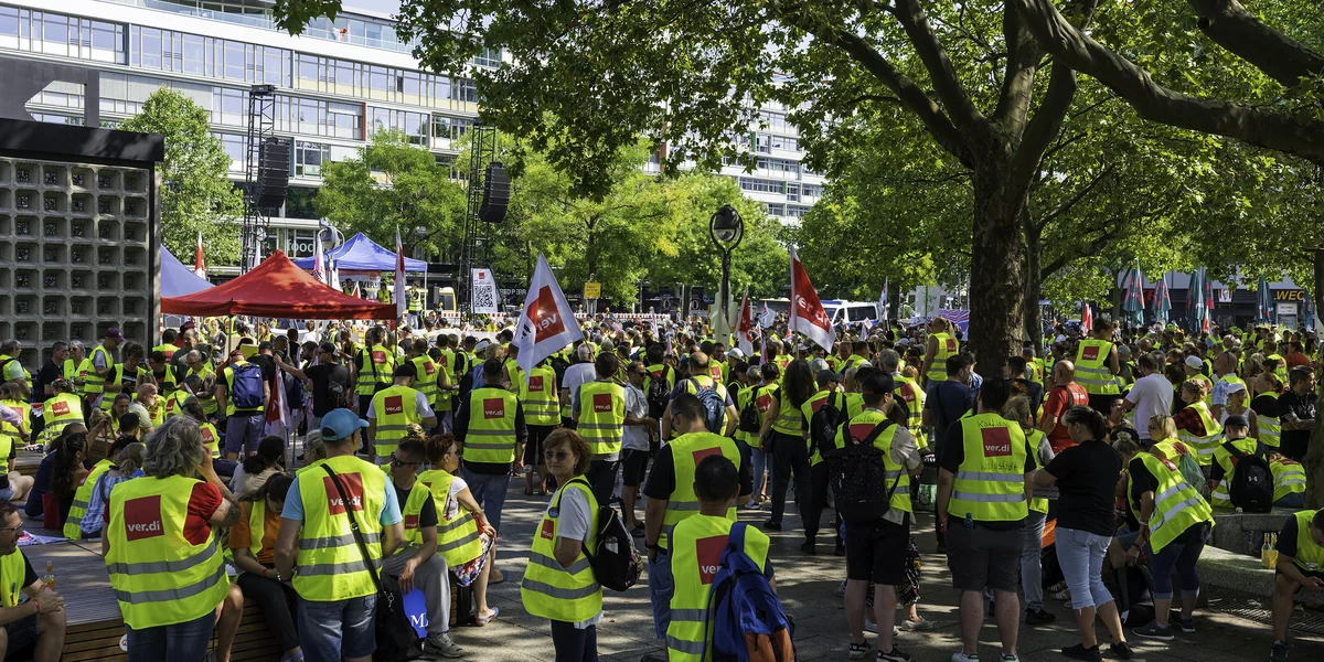 Statt shoppender Tourist:innen, die normalerweise das Bild des Breitscheidplatzes in Charlottenburg bestimmen, ist der Platz vor der Kaiser-Wilhelm-Gedächtniskirche am Dienstagmorgen mit Hunderten Menschen in gelben Warnwesten gefüllt. „Ihr seid es, die den stationären Einzelhandel in dieser Stadt am Laufen haltet!“, ruft Gewerkschaftsfunktionärin Conny Weißbach auf der Bühne der Menge zu. Die antwortet mit einem fast schon ohrenbetäubenden Trillerpfeifenkonzert.
