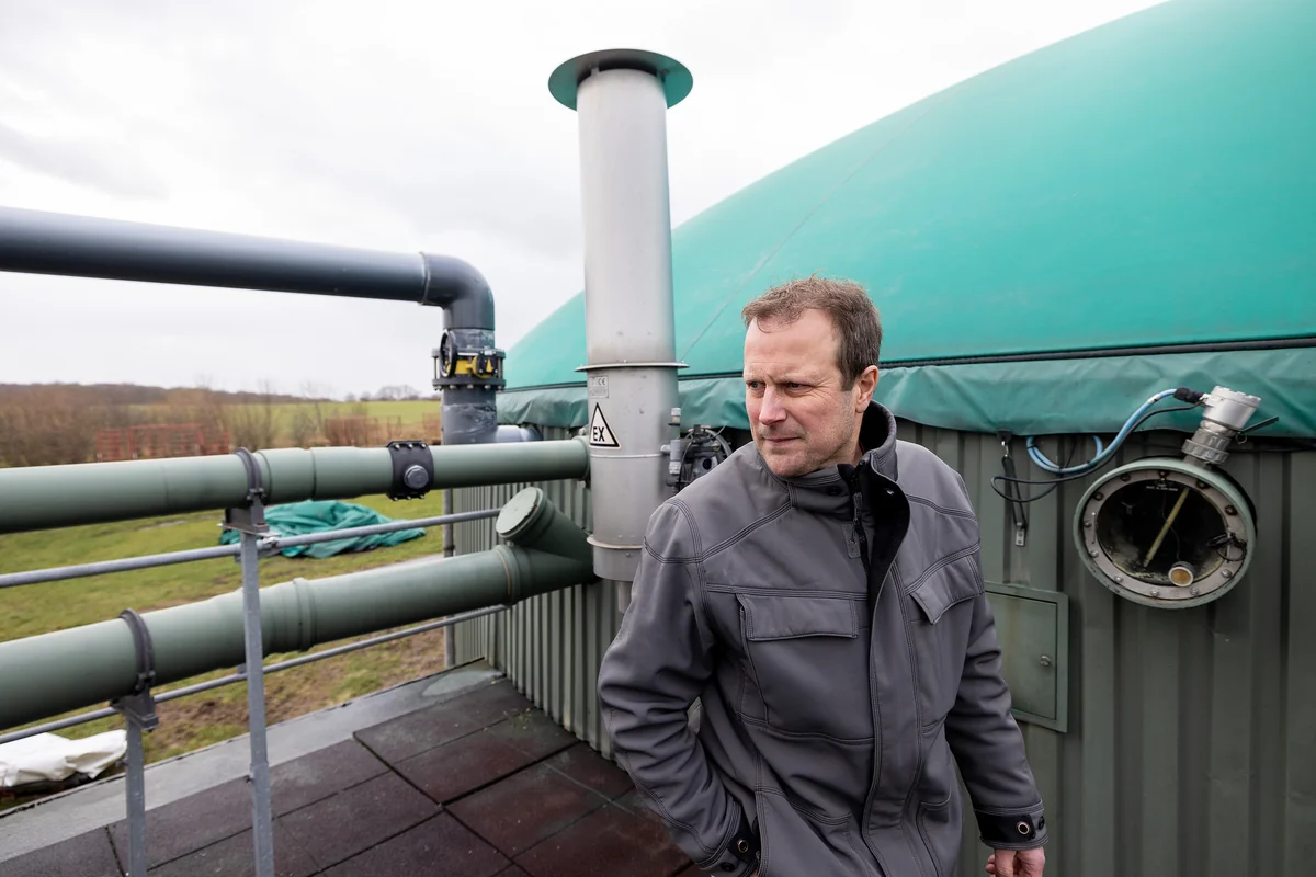 Und läuft los, um das etwas anschaulich zu machen. Mit Schünemanns VW-Bus geht es zum Kuhstall und zur Biogasanlage. Den Kuhstall betreibt ein weiterer Partner, Lars Ohse, Landwirt in Rickensdorf. „Er kümmert sich um die Kühe, wir machen seine Felder mit“, erklärt Müller. Die Biogasanlage betreiben sie gemeinsam. Der Stall, eigentlich mehr eine Leichtbauhalle, an deren Blechwänden jetzt der kalte Januarwind zerrt, wurde 2014 gebaut, für rund eine Million Euro. Damals lag er weit über den geltenden Tierschutzstandards, ein Vorzeigeprojekt.