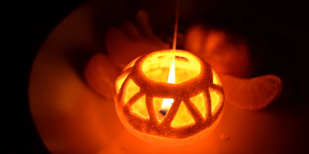 Für ein Extraplus an Sinneserfahrung sei zusätzlich das Basteln einer Mandarinenleuchte angeraten. Dazu achte man beim Schälen darauf, die Mandarine an ihrem Äquator zu teilen und die Schale sauber in zwei Hemisphären zu trennen. Die zentrale Säule der Mandarine, dieser Mittelstrang, um den sich die Spalten gruppieren, sollte dabei – als Docht – an der unteren Hemisphäre befestigt bleiben. Diese befülle man mit etwas Öl, etwa Sonnenblumenöl. Aus der oberen Hälfte schneide man den Pol mit einem Durchmesser von etwa zwei Zentimeter heraus, nach Belieben auch kleine Muster hinein, und setze sie als Deckel auf die untere Hälfte.