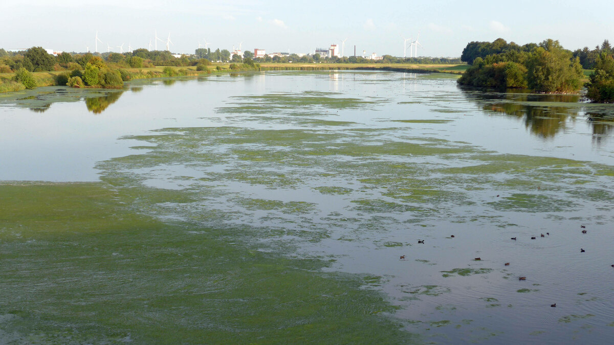 Neuerdings hat sie unter anderem den Bremer Werdersee in Beschlag genommen. So wird das fünf Kilometer lange Stillgewässer parallel zur Weser genannt, auch wenn ein Teil davon eigentlich Kleine Weser heißt. An der breitesten Stelle misst der See 300 Meter, über weite Strecken 80 bis 100 Meter, maximal drei Meter ist er tief. Im Laufe dieses Sommers wuchs also das ganze Gewässer nahezu komplett mit der krautartigen Wasserpflanze zu. Beeindruckende 20 Zentimeter am Tag kann sie schaffen; Halt macht sie erst wenige Zentimeter vor der Wasseroberfläche.