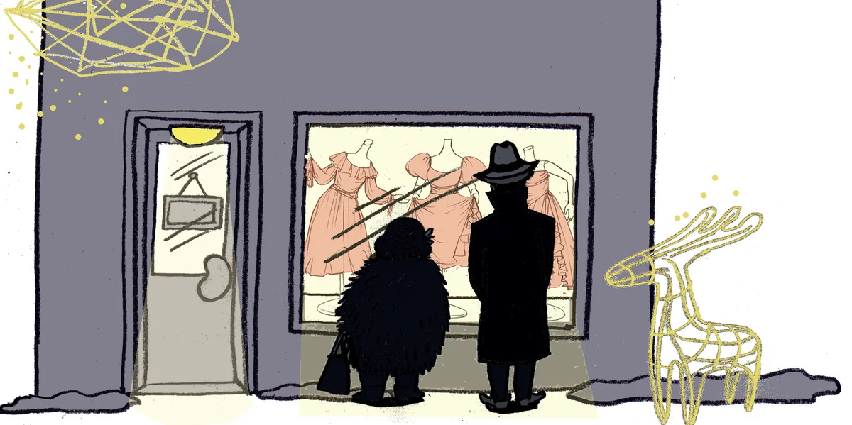 Die Frau neben ihm ist dick, trägt einen Kunstpelz, eine Brille, und auf dem Kopf einen Häkelhut. Beide also mit Hut, einer groß und schlank, eine klein und dick. Beide betrachten das Schaufenster. Im Schaufenster stehen Schaufensterpuppen ohne Kopf und ohne Beine. Ihre Körper stecken auf Stielen und sie tragen zarte Kleider aus Tüll und Seide, gerafft und gerüscht. Manche tragen im Ausschnitt eine Brosche, manche ein glitzerndes Collier am kopflosen Hals. In den Taillen sind Schildchen festgesteckt, auf denen Namen aufgeschrieben sind, Rosemarie, Helga, Elisabeth, Jenny und Zarah.
