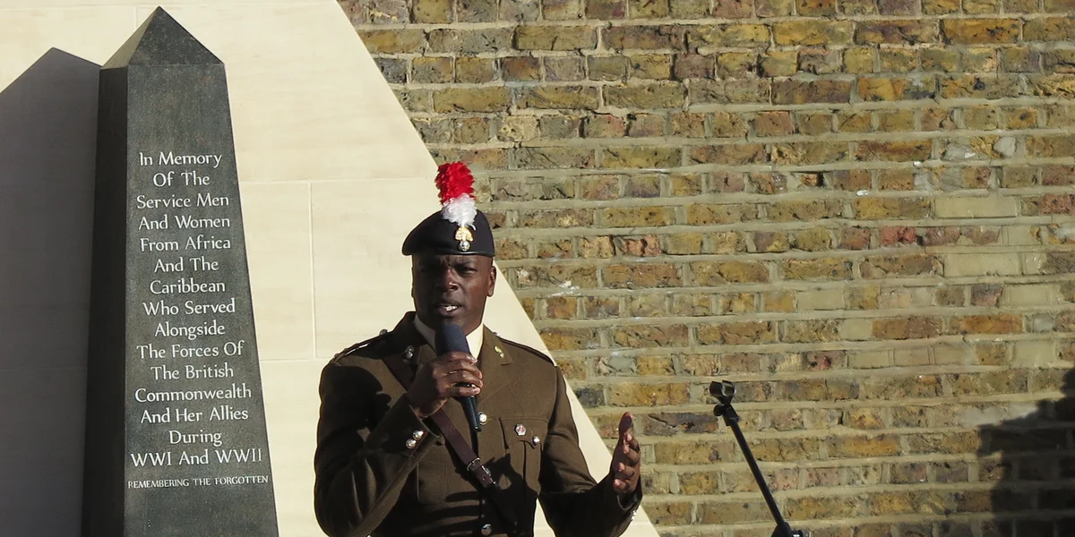 Die Zeremonie beginnt mit Trommeln. Professor Gus John aus Grenada nimmt kein Blatt vor den Mund. „Die Soldaten aus der Karibik und Afrika in den beiden Weltkriegen lebten in von Großbritannien besetzten Gebieten und hatten vorher die Sklaverei erfahren“, deklamiert er. „Trotzdem verschrieben sich diese Menschen, um freiwillig für Großbritannien zu kämpfen“.