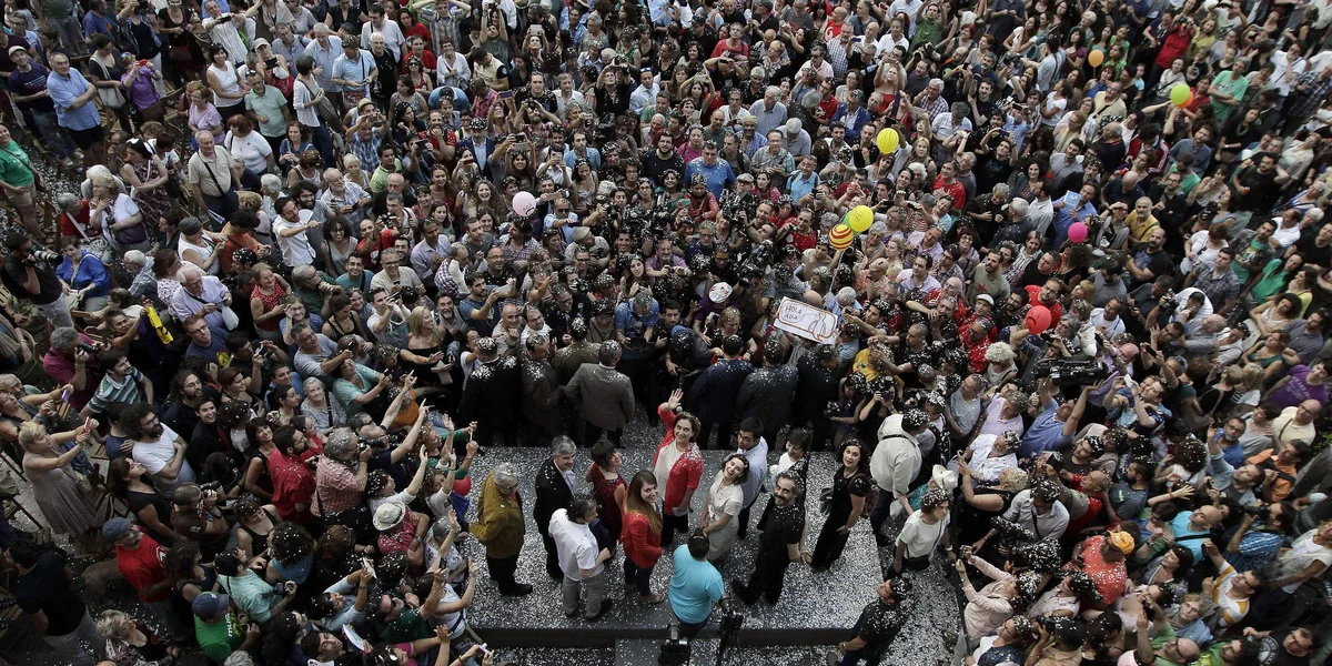 Auch nur Show: Megaparty zur Inthronisierung von Ex-Hausbesetzerin Ada Colau (rote Jacke, winkend) zur obersten Frau Barcelonas Foto: dpa