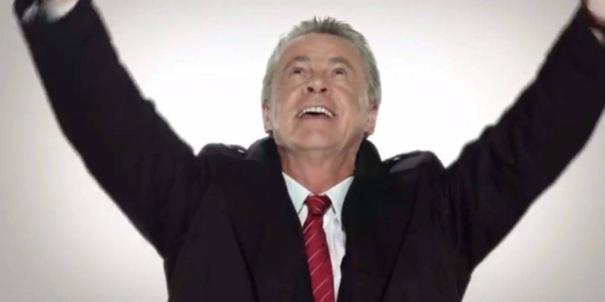 Normalerweise steht der Trainer mit einem Gesicht am Spielfeldrand, das auf seriöse Magenprobleme schließen lässt. Hier gibt er den gut gelaunten Spaßvogel, komplett mit Mantel, zugeknöpftem Kragen und Krawatte. Hitzfeld pfeift auf den Fingern und vollführt eine rätselhafte Wischbewegung. Dann hat er auf einmal Handschuhe an, empfängt aus dem Off einen Ball und verwandelt sich endlich in den dänischen Torhüter Peter Schmeichel. Uff.