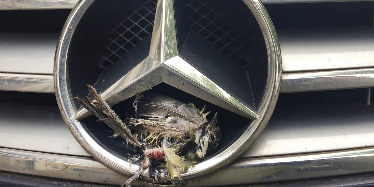 Autos können töten: verendeter Vogel in einem Mercedes-Kühlergrill Foto: Marcus Brandt/dpa