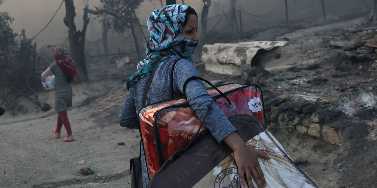 Eine Frau flüchtet im September 2020 aus dem brennenden Lager Moria auf Lesbos Foto: Elias Marcou/Reuters