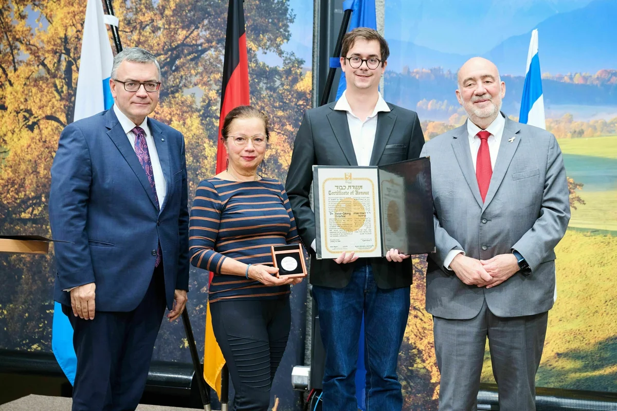 In der bayerischen Landesvertretung ist es soweit. Nach den Reden des Staatsministers und des Botschafters überreicht Prosor Urkunde und Medaille von Yad Vashem an den Enkel Maximilian Früchte. Es ist ein feierlicher Moment