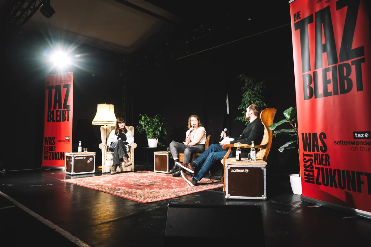 „Wie geht es weiter mit der Klimabewegung?“, heißt die Veranstaltung der Tour zur taz-Seitenwende in Hannover und neben ihm auf dem Podium sitzen Carla Hinrichs von der Letzten Generation und Annika Rittmann von Fridays for Future. Und die machen ziemlich schnell klar, dass sie nicht die Absicht haben, die Köpfe hängenzulassen, nur weil da jetzt demnächst „dieser Mann mit dem Privatflugzeug“ ins Kanzleramt einzieht.