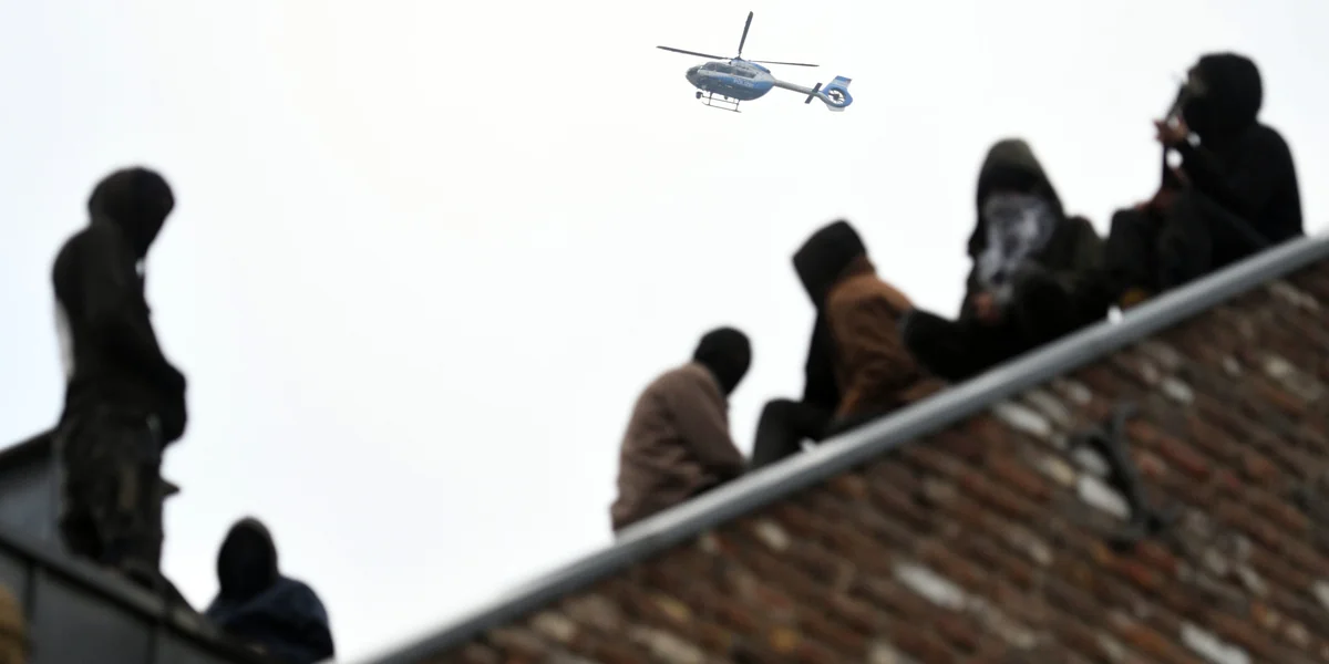 Als die Polizisten das Zimmer im zweiten Stock betreten, sind die BesetzerInnen schon zum Fenster raus. Das Dach ist schräg – und keiner der etwa acht Menschen darauf ist gesichert. Auf der Dachspitze schrammelt ein Besetzer nun Gitarre, vom Himmel dröhnt der Polizeihubschrauber, unten vor dem Haus blasen Polizei und Feuerwehr Fallkissen auf. KletterpolizistInnen haben noch nichts zu tun, stehen unten, schauen rauf, die vielen Karabiner an ihren Gurten funkeln wie Behang an den Gürteln von Bauchtänzern.