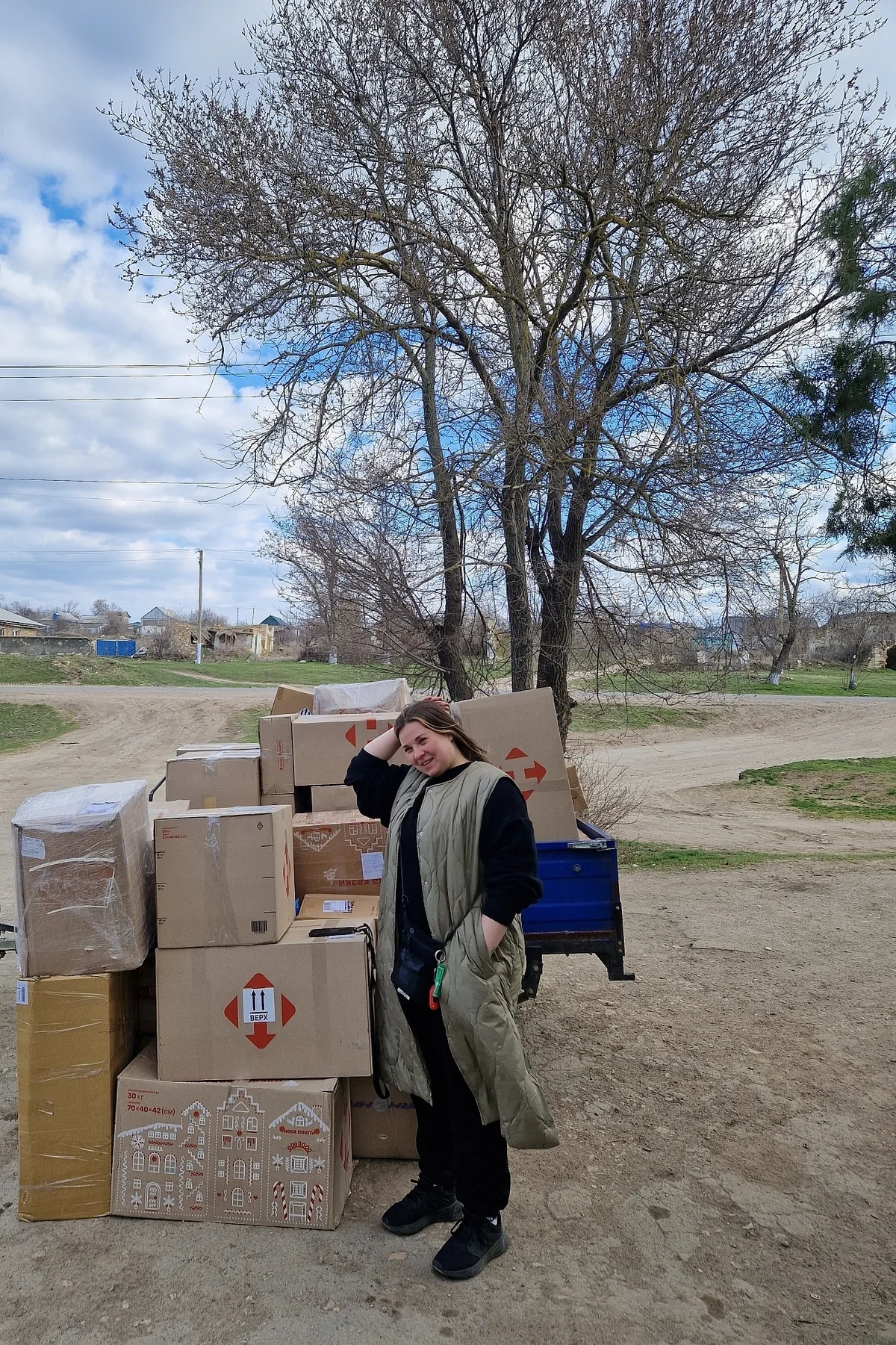 Die Hoffnung heißt Masha. Maria Khomyakova, 33 Jahre alt, weiches Gesicht und weiche Stimme. Aber es liegt auch etwas Raues in dieser Stimme, das sekundenschnell erblüht, wenn Masha lacht. Wenn sie schreien muss zwischen Männern und Motoren. Masha ist Szenenbildnerin in Kyjiw und sie ist diejenige, die die Steine und die Bretter bezahlt hat, die in Bila Krynytsia und Bilohirka vor den Häusern liegen. Sie hat sich zusammengetan mit anderen Frauen. Sie haben eine Organisation gegründet, „Women’s Forum“, sie haben Gelder im Ausland gesammelt, und dann haben die Frauen Trucks gemietet, Fahrer bezahlt, Steine und Holz.
