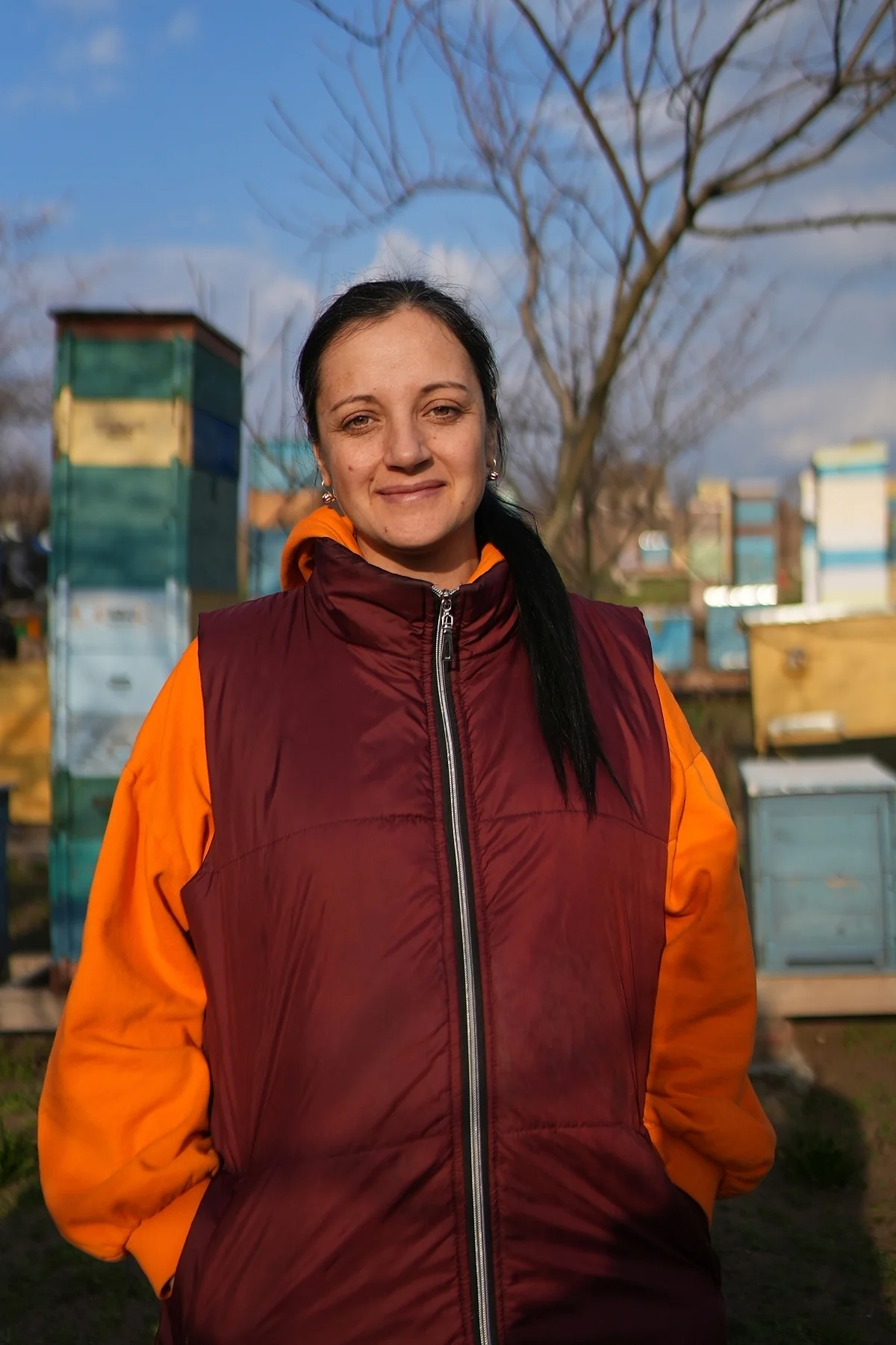 Wärme ist Hoffnung. Es wird wärmer werden und Yulias Bienen werden fliegen. Okay, eigentlich fliegen Yulias Bienen schon, seit Mitte Februar. Aber sie trainieren nur ihre Flügel, werfen die Scheiße ab, die sie während des Winters gesammelt haben. Yulia Petrienko, 36 Jahre alt, muss sie mit Honig füttern, damit ihre Bienenvölker nach dem Winter wieder wachsen können. 60 davon leben in Holzkästen hinter ihrem Haus, Holzkästen in Blau, Zartrosa und Grün. Fotos auf ihrem Mobiltelefon zeigen Erde und Asche an dieser Stelle.