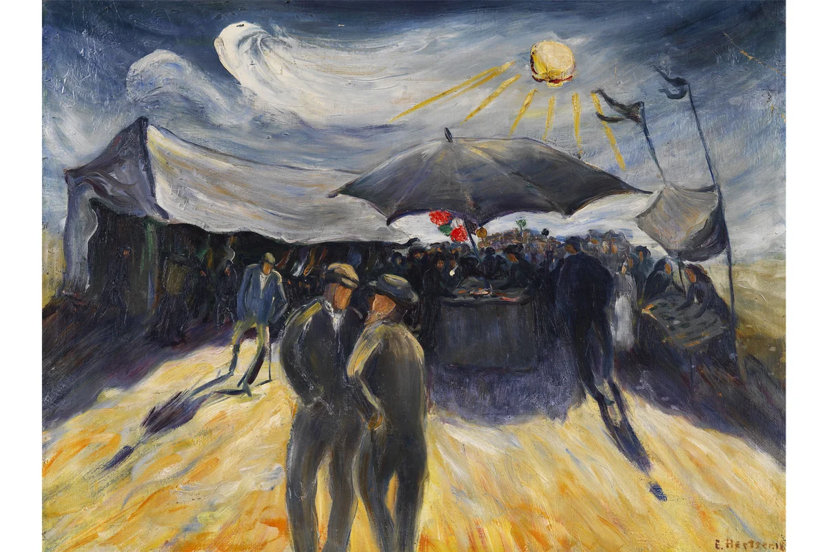 Alles Leben scheint aus dem Mann gewichen zu sein. Er steht im Vordergrund des 1918 entstandenen Ölgemäldes „Die Mobilmachung“ von der deutschen Malerin Else Hertzer, das derzeit in den Ausstellungsräumen des Vereins Berliner Künstlerinnen 1867 e. V.(VdBK) zu sehen ist. Die Schultern hängen, das Gesicht ist gelblich-grün. Wo die Augen sein sollten, klaffen zwei schwarze Löcher.