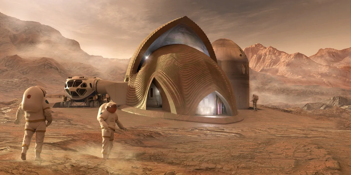 Wie riesige Muscheln aus Stahl glitzern die Häuser vor den Kratern des Mars im Sonnenlicht. Ihre gewölbte panzerartige Fassade schützt die Astronaut:innen vor der Strahlung und Kälte des Alls. Was klingt wie eine Science-Fiction-Fantasie, wird tatsächlich immer greifbarer: Von einer Raumstation in der Umlaufbahn des Mondes aus plant die Nasa mit der Artemis-Mission erste Astronaut:innen auf den Mars zu schicken. Auf der Mondoberfläche soll dafür eine Forschungsbasis errichtet werden – ein Zuhause für Forscher:innen in der Ferne. Folgen irgendwann auch Gebäude auf dem Mars?