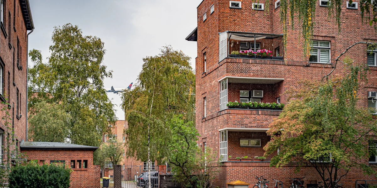 Für zusätzliche Abwechslung und nachbarschaftliches Miteinander sorgen üppige Grünzonen. Dafür ergänzte Gartenarchitekt Leberecht Migge die vorhandene Baum- und Wiesenlandschaft nahe der Jungfernheide durch zusätzliche Birken, Pappeln und Kletterpflanzen, die sich an Müllhäusern hinaufziehen.