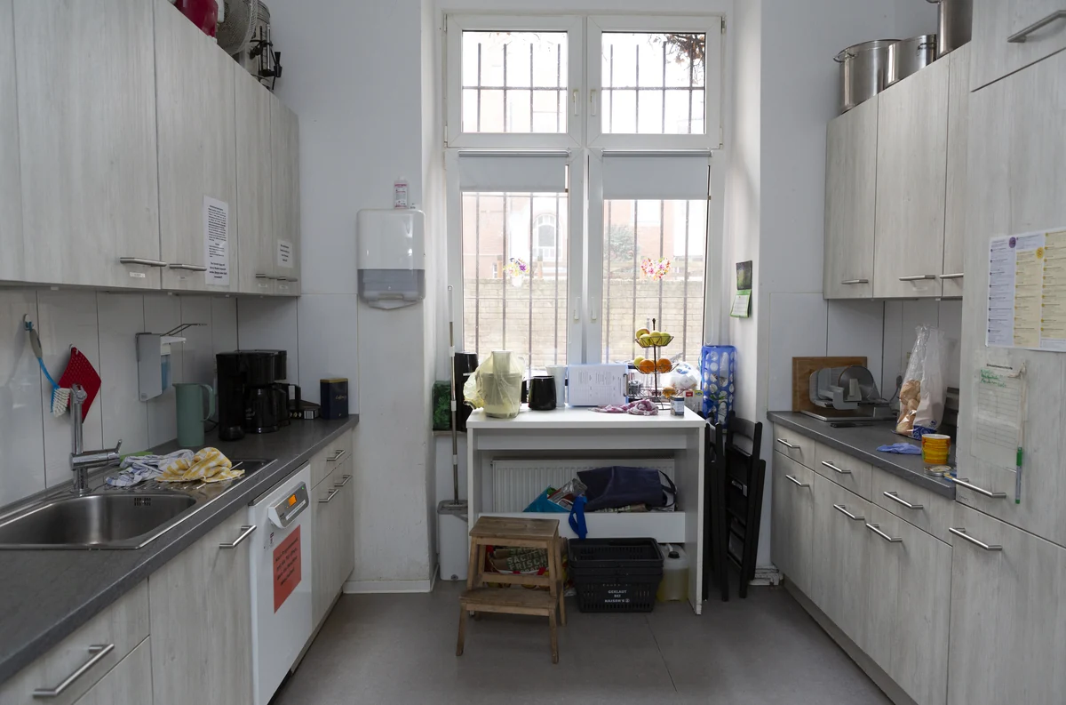 Ab 10 Uhr gibt es in Evas Haltestelle Frühstück; das Mittagessen, von ehrenamtlichen Helferinnen zubereitet, wird ab 13 Uhr ausgegeben. Gemüseauflauf steht an diesem Tag auf dem Speiseplan. Manche Frauen bleiben nur kurz, um zu essen, einen Kaffee zu trinken und das Handy aufzuladen. Andere länger, weil sie ihre Wäsche waschen, Kleidung in der Kleiderkammer tauschen oder duschen wollen. Es gibt nur eine Dusche, der Andrang ist groß. Viele Frauen verbringen auch den ganzen Tag in der Einrichtung.