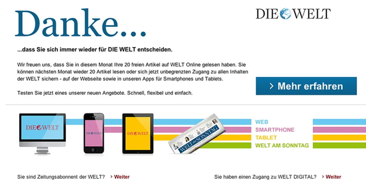 Der General Manager Digital wollte nur schon vorab allen Kritikern, die nun meinten, dass eine solche Bezahlschranke doch umgangen werden könnte, den Wind aus den Segeln nehmen. Botschaft: Ja, man wisse, dass auch in Zukunft auf anderen Websites (also auch bei Google) verlinkte Welt-Artikel frei zugänglich blieben. Aber man wolle eben keine Mauer, sondern ein „nutzungsabhängiges Bezahlmodell“ errichten. Als erste überregionale Tageszeitung in Deutschland. Ab heute kann jeder, der nicht durch einen gezielten Link auf die Seite geleitet wurde, pro Monat nur noch 20 Artikel bei welt.de lesen. Ab dem 21. erscheint der Satz „Danke, dass Sie sich immer wieder für Die Welt entscheiden“ – und die Bitte, nun doch ein Abo abzuschließen.