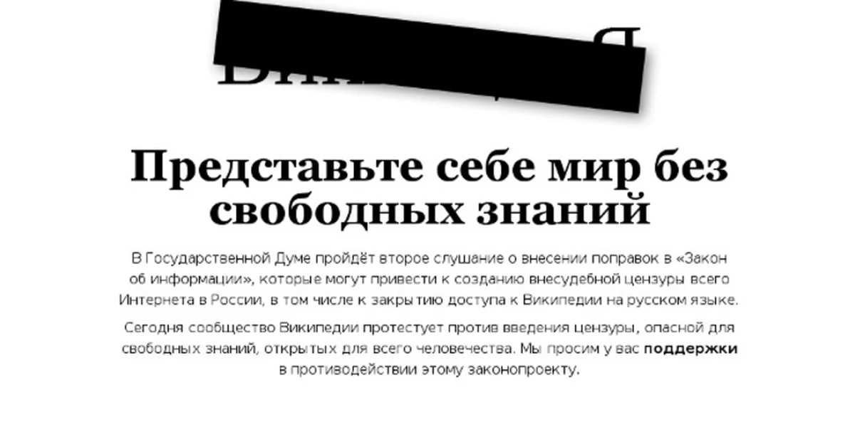 „Stell dir ein Welt ohne freien Wissenzugang vor“, heißt es auf der Startseite unter einem schwarzen Balkan, der das Wikipedia-Logo verdeckt. Das geplante Gesetz, so der Text weiter, könne zu einer außergerichtlichen Zensur des ganzen Internets in Russland führen, was bedeute, dass auch Wikipedia auf Russisch nicht mehr erreichbar sei. „Wir wenden uns gegen die Einführung von Zensur, die eine Gefahr für freies und der gesamten Menschehit zugängliches Wissen bedeutet.“