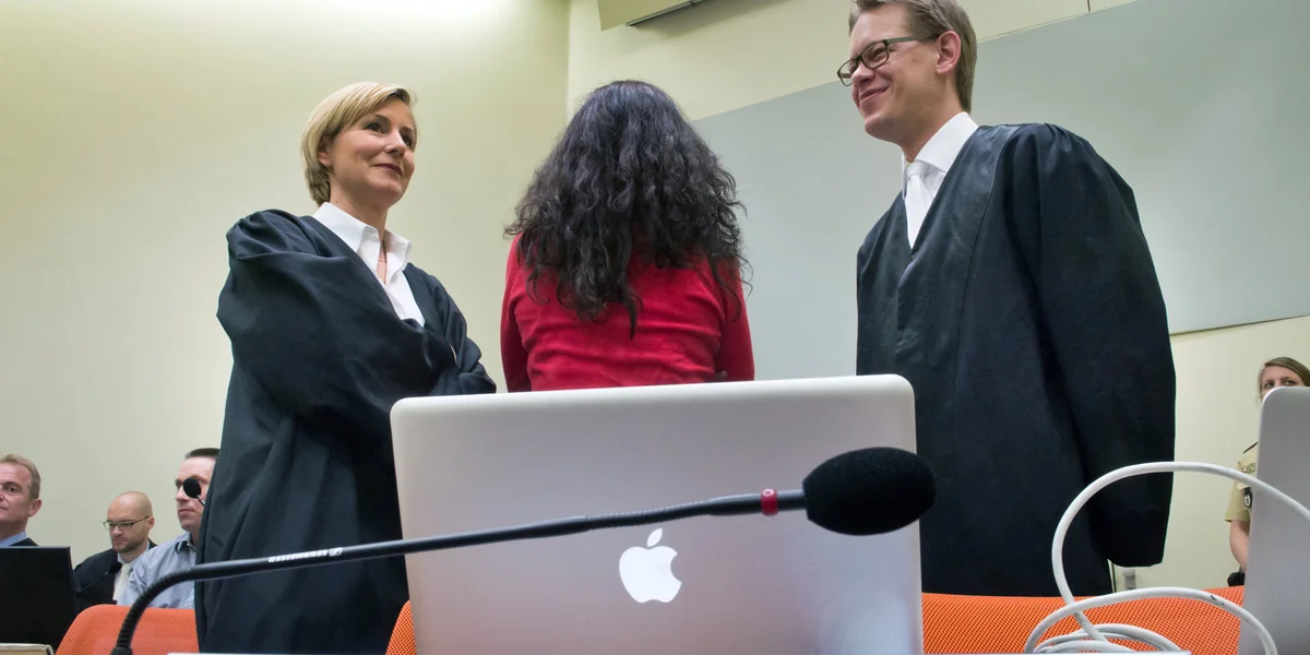 Jetzt, 13 Jahre später, sitzt die Deutschiranerin im Zeugenstand des Oberlandesgerichts München. Sie ist eine schöne Frau: hohe Wangenknochen, langes braunes Haar bis zur Hüfte, eleganter hellgrauer Hosenanzug. Doch unter dem Make-up sind die Narben geblieben. Noch immer schmerzen Holzsplitter im Kiefer. Fachkundig listet M. die Folgen der Explosion auf – sie ist selbst Chirurgin.