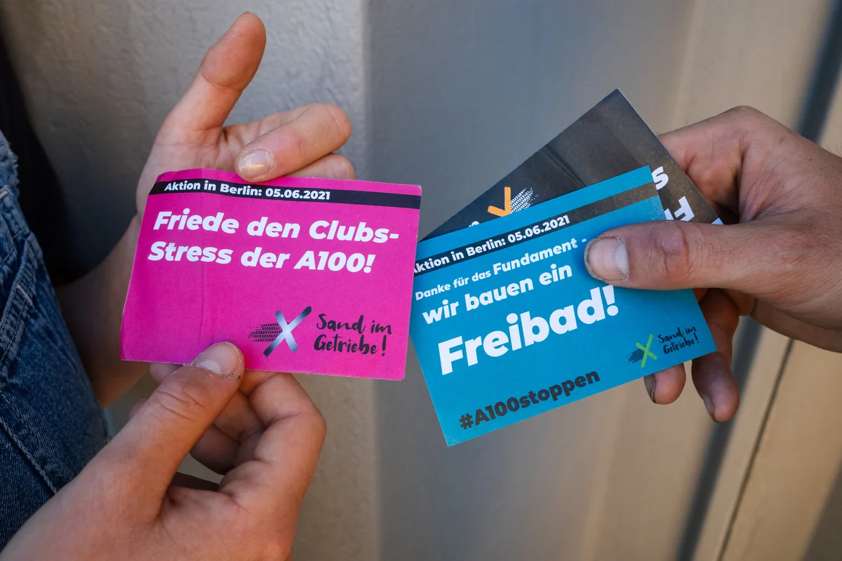 5. Juni: Für diesen Samstag rufen „Sand im Getriebe“ und „Extinction Rebellion Berlin“ zu einer Massenblockade der Baustelle der A100 zwischen Neukölln und Treptow auf. Die Aktion des zivilen Ungehorsams ist Teil von bundesweiten Protesten für eine sozial gerechte Verkehr- und Mobilitätswende. Parallel startet um 12 Uhr eine Fahrrad-Demonstration der Bürger*innen-Initiative „A100 stoppen“, zu der auch Fridays for Future, Changing Cities und weitere Gruppen aufrufen. Die Demoteilnehmer wollen vom Platz der Luftbrücke kommend über die A100 radeln und skaten, ab 14 Uhr soll es eine „Sit-in-Kundgebung“ an den Treptowers/Elsenbrücke geben.