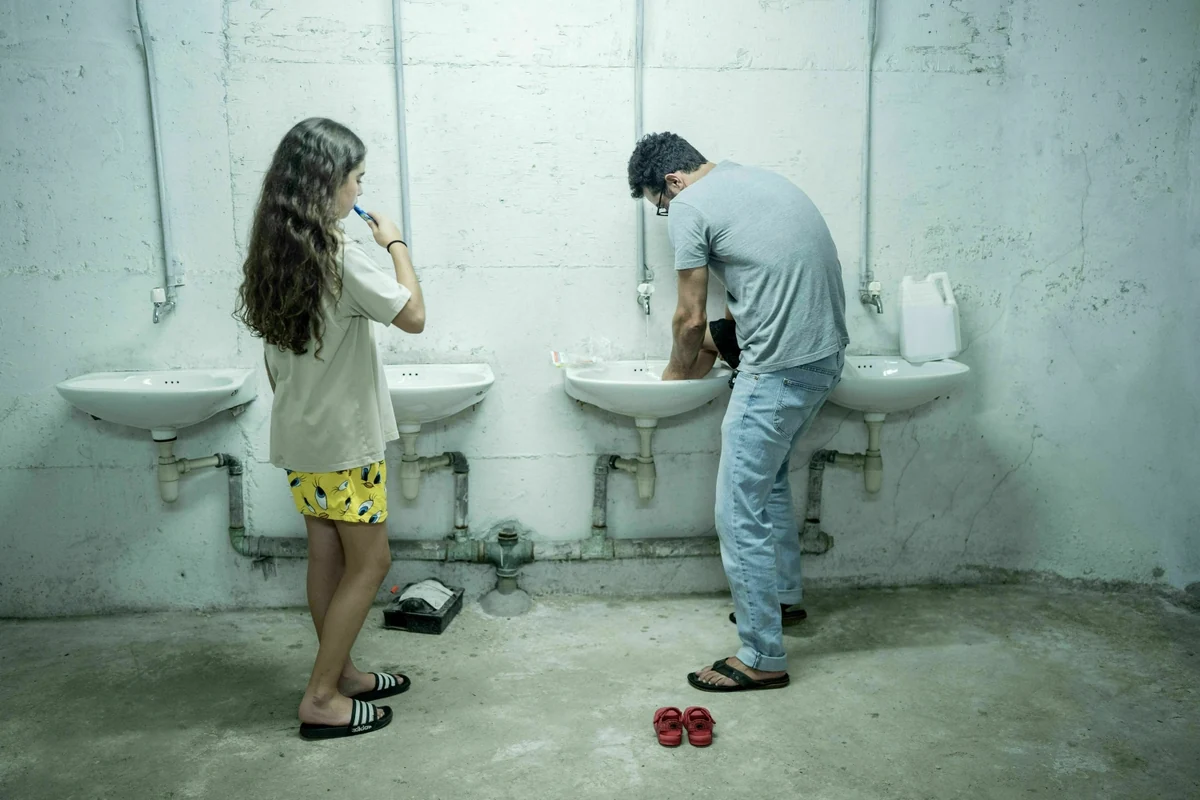 Wer „Glück“ in Israel hat, taumelt noch halb schlafend nur ein paar Schritte in den Schutzraum der eigenen Wohnung oder legt sich abends direkt dort schlafen. Andere stehen in den ersten Sekunden nach einem Bombenalarm direkt senkrecht im Bett – drei Jahre verpflichtender Militärdienst hinterlassen Spuren. Yonit und Ziv bleibt keine Zeit zum Zögern: Ihr Gemeinschaftsbunker liegt im Keller des Wohnblocks in Tel Aviv, jede Sekunde zählt.