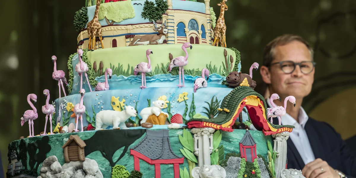 Wie oft bei Jubiläumsfeiern – erst recht, wenn eine Institution wie der Berliner Zoo seinen 175. Geburtstag begeht – fühlt man sich ein wenig wie auf einem Veteranentreffen. „Grüß dich!“, sagt Walter Momper zu Eberhard Diepgen, „alles frisch?“ Beide, sichtlich in die Jahre gekommen, waren mal Regierende Bürgermeister von Berlin. Momper (SPD) hat sich eine rotweiße Krawatte umgebunden. Diepgen (CDU) trägt den oberen Hemdknopf offen. Schnellen Schrittes streben sie der Bühne zu, auf der die Geburtstagstorte steht: ein 175 Zentimeter hoher „Tortentraum“, wie der Zoo in seiner Einladung schreibt. Giraffen, Flamingos und Flusspferde aus Zuckerguss schmücken die einzelnen Schichten. Das Antilopenhaus mit den minarettartigen Türmchen, das älteste erhaltene Gebäude im Zoo, ist nachgebildet, auch das Elefantentor. Eine Woche lang habe eine Charlottenburger Konditorei an dem Kunstwerk gearbeitet, wird erzählt.