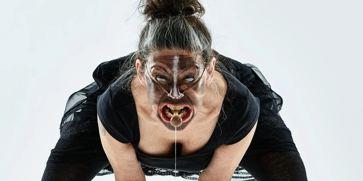 Zu Beginn verteilt Elisabeth kleine, etwas zehn Zentimeter lange Stöckchen an die TeilnehmerInnen. Die müsse man in den Mund stecken, erklärt sie, quer vorne in die Unterlippe – und demonstriert es. Der Effekt ist immens: Gruselig sieht sie aus und gleichzeitig komisch. Das ist ein Gegensatz, der, wie wir lernen werden, im Maskentanz grundlegend zum Konzept gehört.