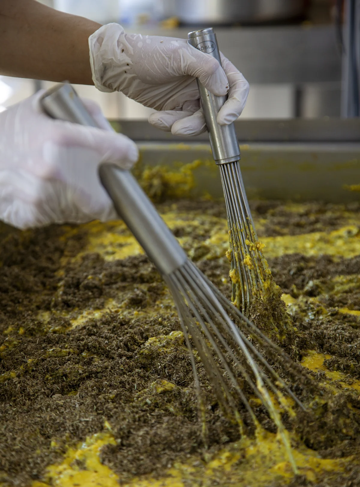 In der Luft hängt der Geruch von Kreuzkümmel und Kurkuma. Eine junge Frau steht vor einer eckigen Kochwanne. Mit einem Stabmixer rührt sie einen senfgelben Brei aus Kichererbsenmehl und Falafelgewürzen. Ihre Kollegen gegenüber sind einen Produktionsschritt weiter und streichen die eingedickte Masse auf Blechtabletts. Der nächste stanzt sie in 24 flache Quader, anschließend wandern die Stücke noch durch eine Verpackungsmaschine und einen Pasteurisierungsschrank. Fertig ist der Kichererbsentofu – made in Berlin.