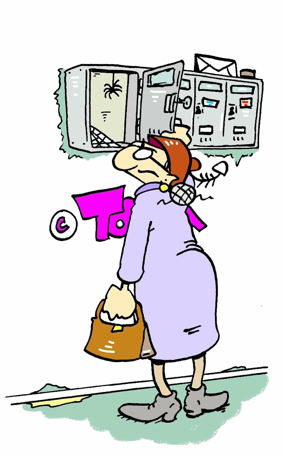 ©Tom: Das ist die Post-Oma – zusammen mit dem Teufel. Den Teufel mochte ich immer, auch wegen dieser alten, oft psychedelischen Höllendarstellungen voller Monsterfiguren. Ich bin katholisch aufgewachsen, und ich finde, man sollte die Hölle nicht den Pfaffen überlassen. Auf die Post-Oma kam ich durch ein preußisches Postamt bei mir um die Ecke, mit Beamten, die einen wie Dreck behandelt haben, und durch die Wilmersdorfer Witwen. Daraus ist diese etwas berlinernde, aggressive Figur entstanden. Das Setting funktioniert bis heute, obwohl es das alles so gar nicht mehr gibt.