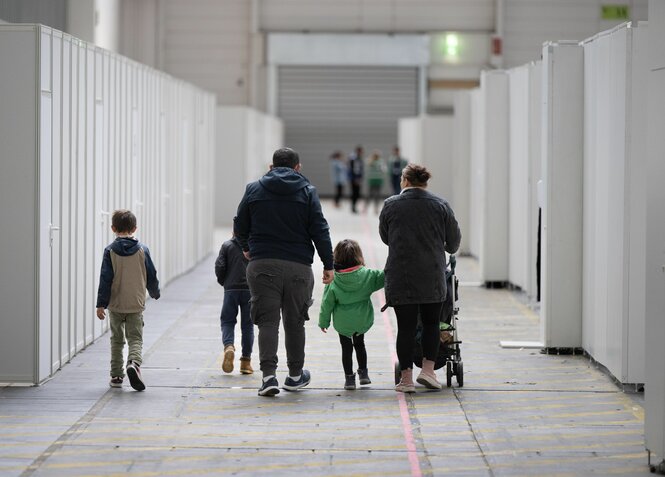 Eine Familie geht durch die zu einer Massenunterkunft umfunktionierten Messehalle in Frankfurt Foto: Boris Roessler/dpa