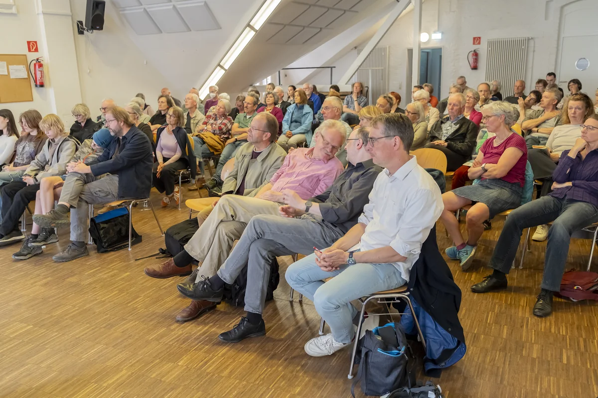 Wie er seinen Kindern erklären solle, dass in der aktuellen Politik die Themen „Aggressivität und Militär“ eine so große Rolle spielten, wisse der Mann nicht, sagt er. Die Gefühle der Verunsicherung konnten aber auch die Referent:innen nicht auflösen. Für den Zuhörer eine Enttäuschung: „Das, was aktuell in der Welt passiert, will ich nicht. Ich hatte gehofft, heute Abend Antworten auf die gesellschaftlichen Fragen zu erhalten.“ Damit trifft er auch bei anderen einen Nerv, Applaus brandet auf.