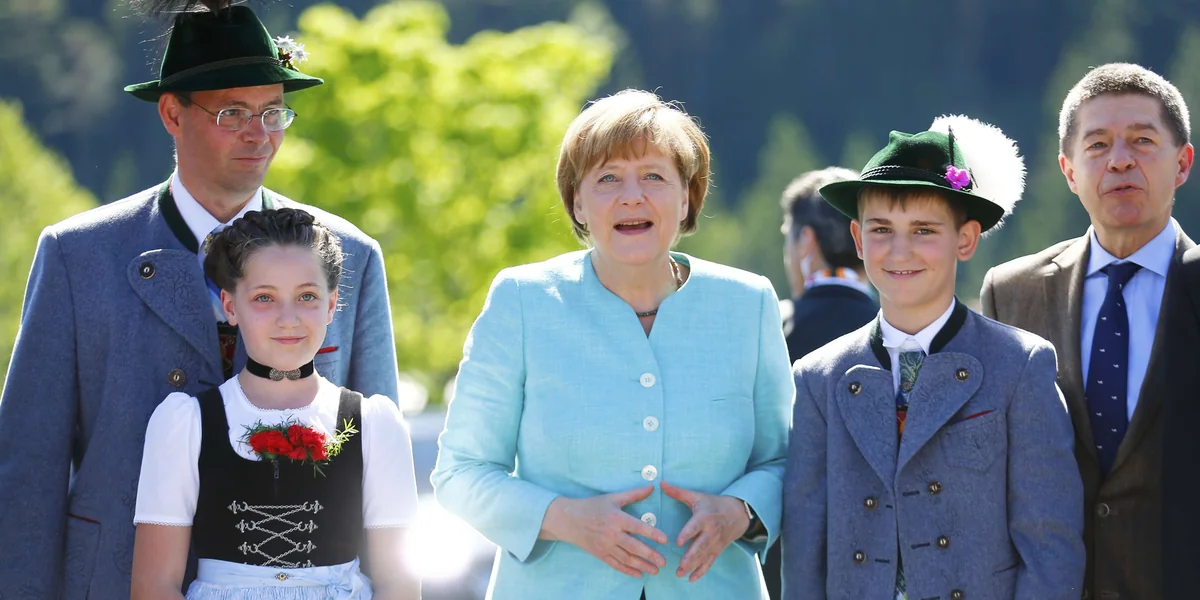 Aus dem Schatten tritt die Kanzlerin und begrüßt die angereisten Staats- und Regierungschefs vor dem imposanten Alpenpanorama. In der ersten Arbeitssitzung sollte es um die Themen Weltwirtschaft, nachhaltiges Wachstum und gemeinsame Werte gehen. (dpa)