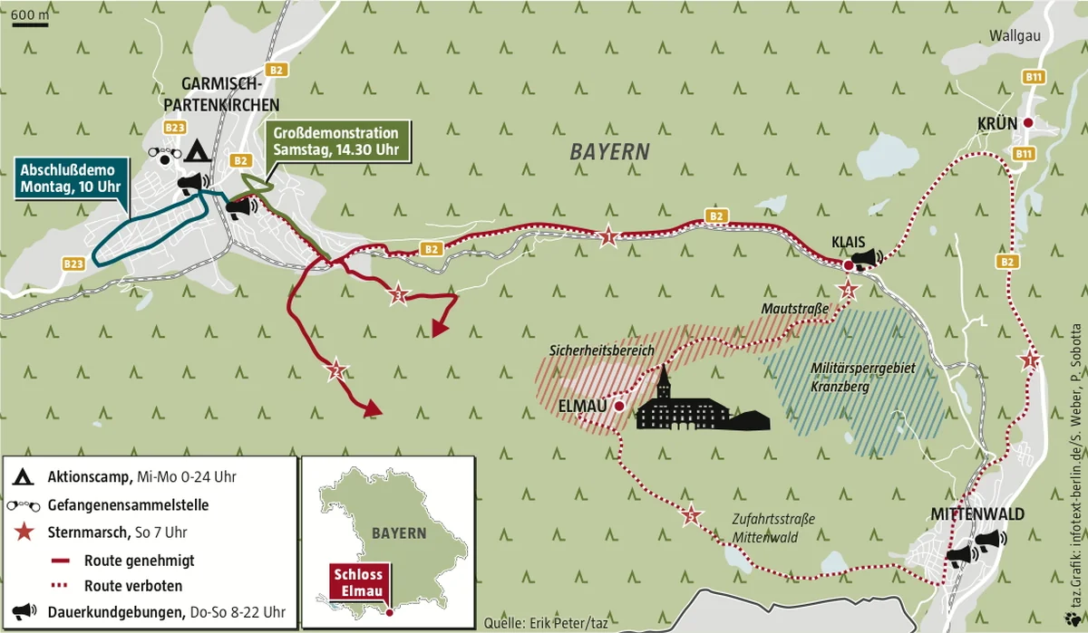 Nicht mal ein zünftiger Camping-Urlaub ist in den Alpen von Garmisch derzeit erlaubt: DemonstrantInnen, die Isomatten oder Schlafsäcke dabei haben, werden von der Polizei freundlich gebeten, diese nicht mit auf den Sternmarsch zu nehmen. So soll verhindert werden, dass sie sich irgendwo gemütlich einrichten. (mkr)