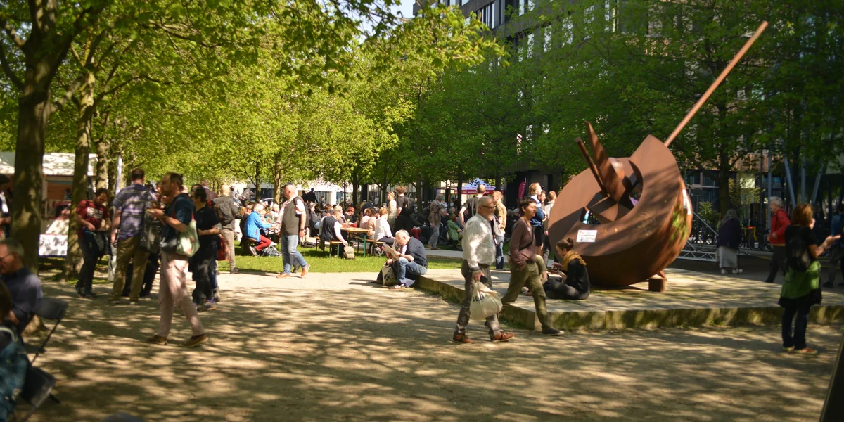 Man hörte jedenfalls: Kindergezwitscher und eher erwachsenes Gemurmel der Menschen im Besselpark, die an Tischen saßen, vor dem Big Screen Platz genommen hatten, um dem Mainstream zuzuhören, übertragen aus dem Panoramaraum im 6. Stock des taz Hauses?