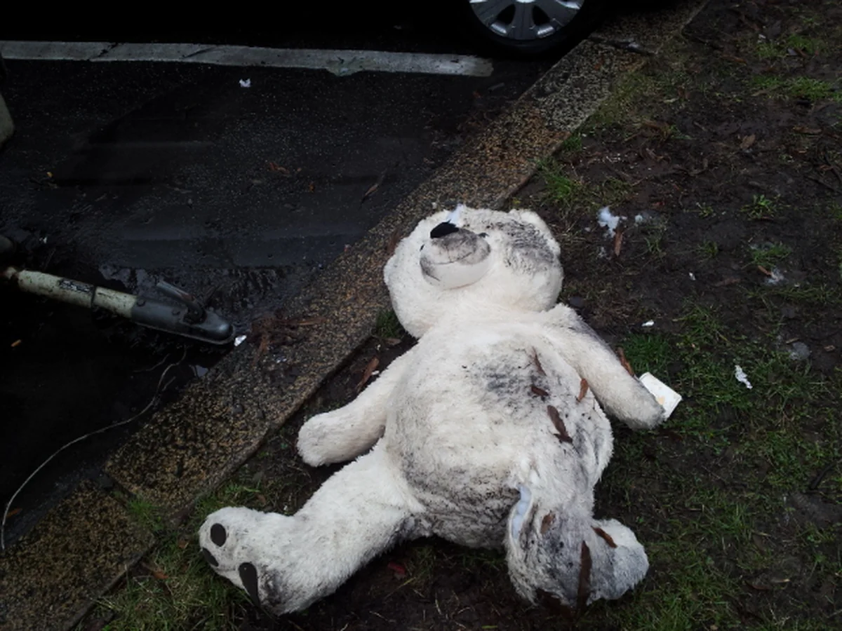 Der Kopf gespalten, am Bauch mehrere große, offene Wunden, die Arme und Beine weit von sich gestreckt, der ganze Körper von Kampfspuren übersät, liegt der Teddy nun tot in einer Schlammpfütze. Ob er überlebt hätte, wenn man ihn sofort medizinisch versorgt hätte, ist noch ungeklärt. Dass er mit einem Grinsen im Gesicht gestorben ist, das auf seinen ramponierten Leichnam immer noch zu sehen ist, könnte auf eine mögliche letzte Begegnung mit einer ihm bekannten Person hindeuten.